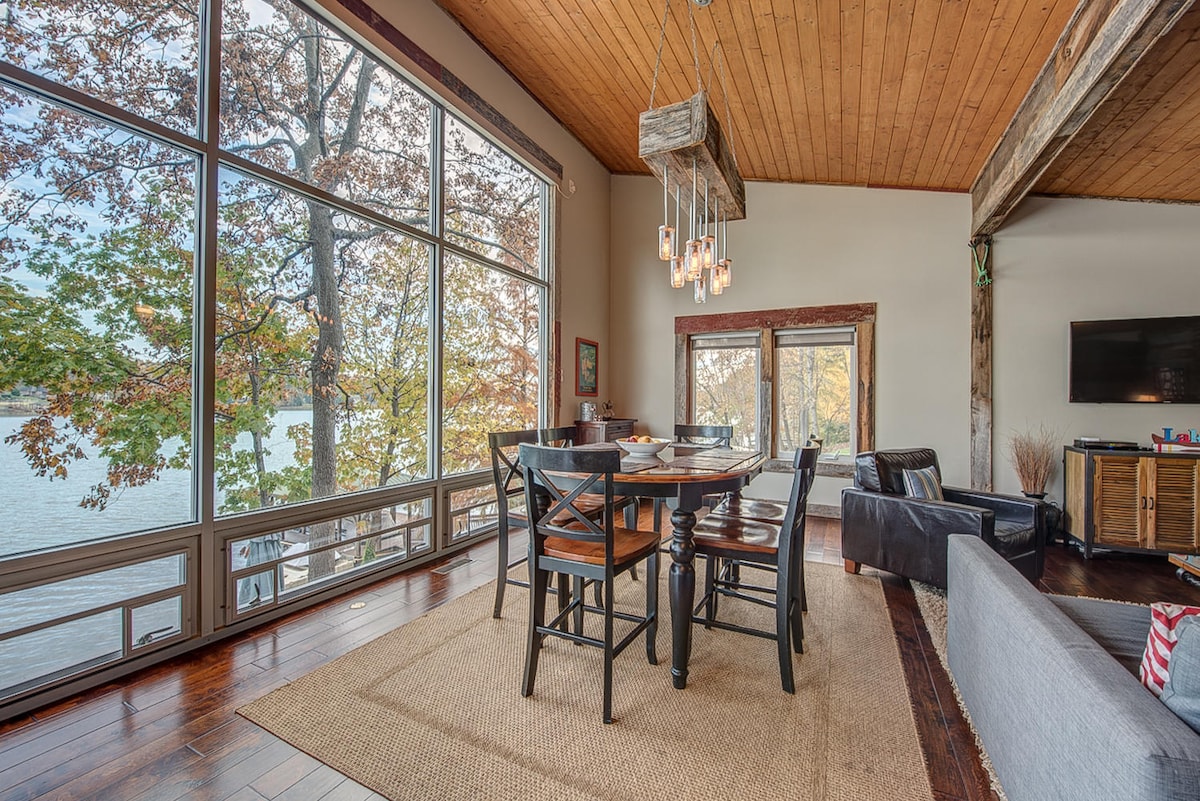 - Almost an acre with 382 feet of shoreline, with stunning lake views from every level. - Fully stocked kitchen with island and coffee bar, vaulted ceiling dining area for 8. - Covered back deck with a wood-burning fireplace, and lakeside fire pit for ultimate relaxation. - Indoor/outdoor ping pong and air hockey tables, patio with a hot tub and grill. - Ample yard space for games, corn hole provided, private dock with sitting area, water gear, including 3 kayaks and 2 SUP & a basketball hoop