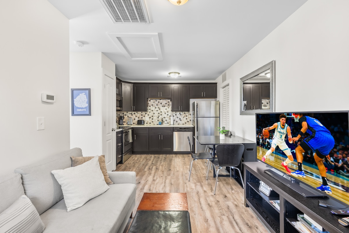 Cozy, stylish one-bedroom unit located less than 5 mins from downtown Charlotte. This well appointed flat really has it all! Sit back and relax in the inviting living room and enjoy Netflix and other complimentary streaming services on the large flat screen tv. Prepare a delicious meal in the full kitchen, which includes stainless steel appliances. Or get some quality rest on our comfortable queen sized pillowtop mattress. We have it all here for you. The airport is 10mins away (6 miles).