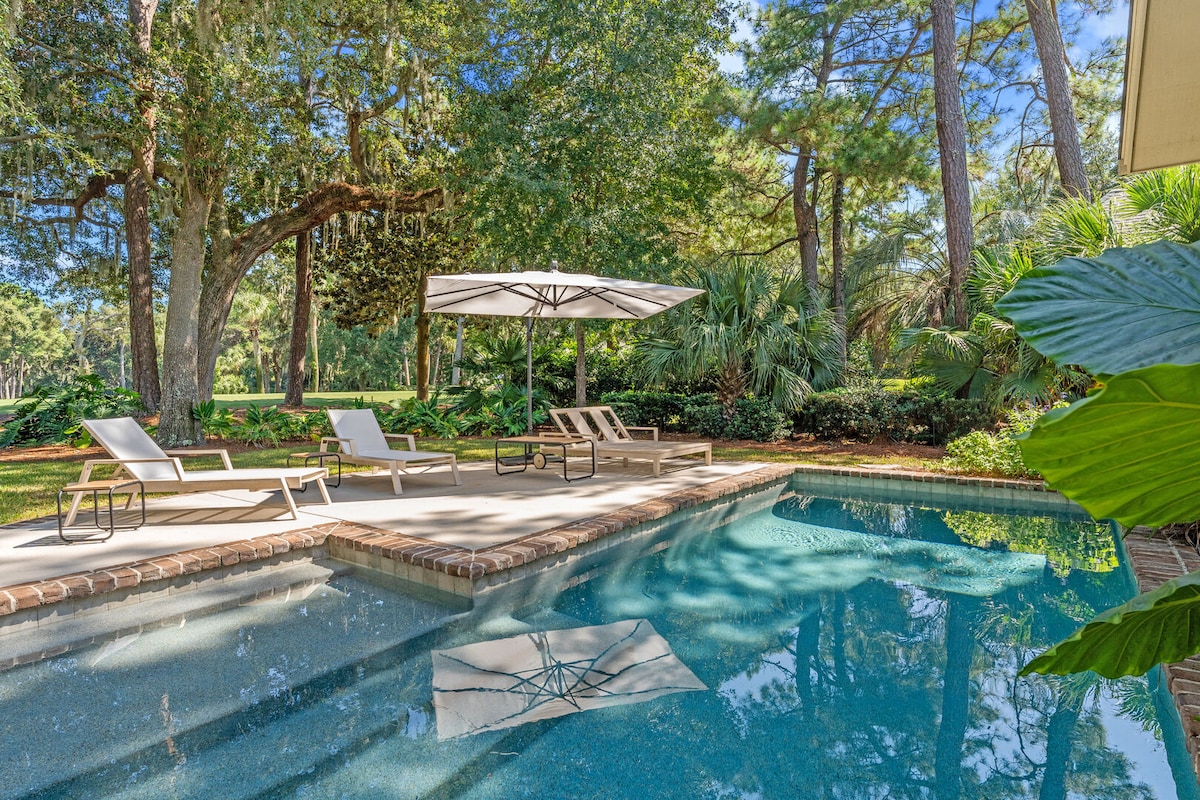 Lovely 3 BR home on #2 tee of the Fazio golf course in Palmetto Dunes Resort. Near tennis/pickleball center, general store, & restaurants. Newer pool and spa. Quartz countertops. Two King BRs, 3rd BR with 2 Queens. Flat screen TVs, cable, ROKU in all BRs. Doorbell cam at front door porch with recording capability for host/guest safety. Beach access @ Omni resort and the Dunes House is a 5-10 min ride by bike and a 15 min walk. Beach towels/umbrellas/chairs not provided. Pool/spa not heated.