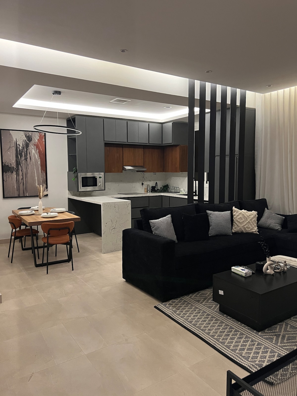 استرخ في هذا المسكن الهادئ والأنيق بالحي الراقي واستمتع بتجربة مريحة ومتكاملة حيث تتميز الوحدة : - سهولة الوصول مشياً إلى قهوة راقية، ممشى مدينة مسك الخيرية، متجر بقالة، مغسلة ملابس. - قربها من الفعاليات المصاحبة لموسم الرياض ومن طريق الملك خالد وقربها من الحي الدبلوماسي. - دخول ذاتي - صالة واسعة مفتوحة على المطبخ وطاولة الطعام - مواقف خارجية مجانية امام المبنى - شاشة 70 بوصة بجودة عالية لتجربة مشاهدة ممتعه + اشتراك نتفلكس غسالة 7KG مع تنشيف 100%