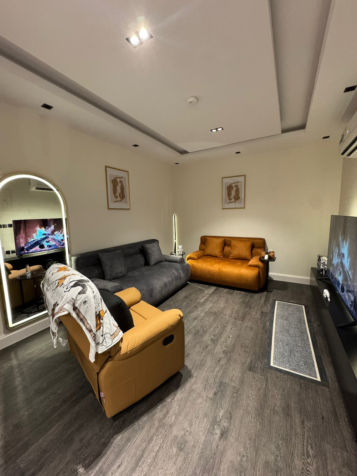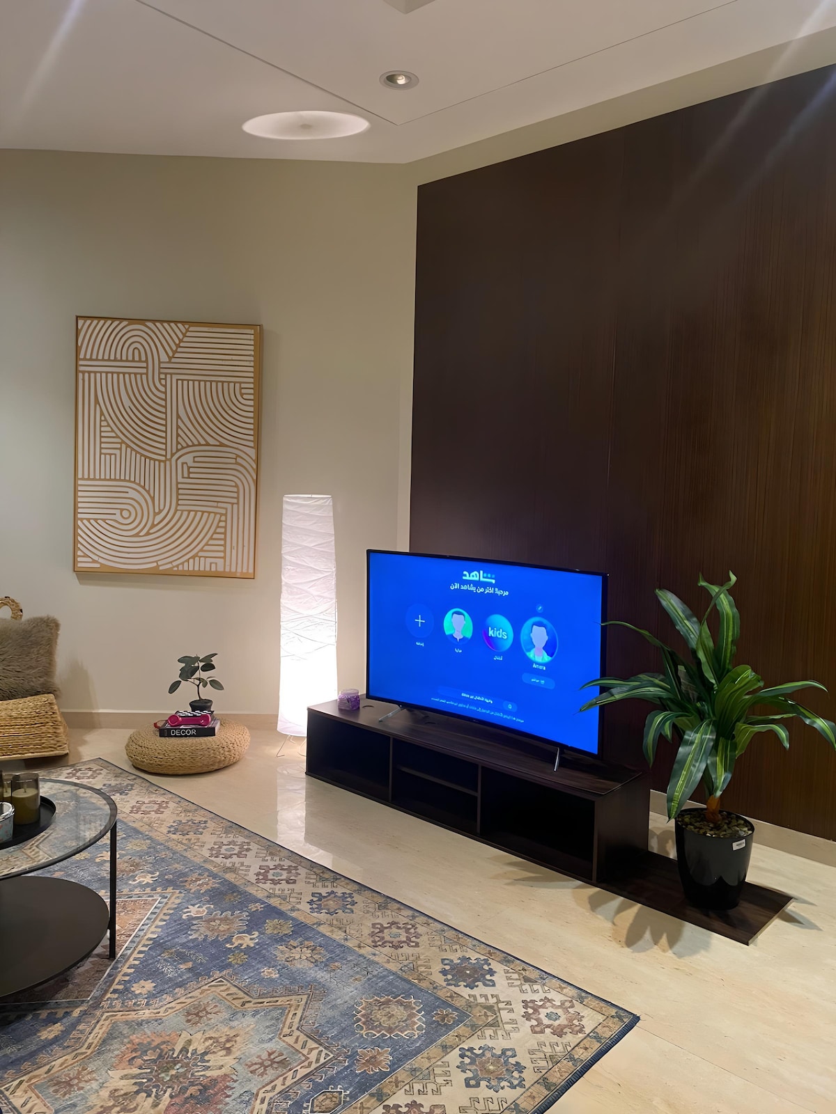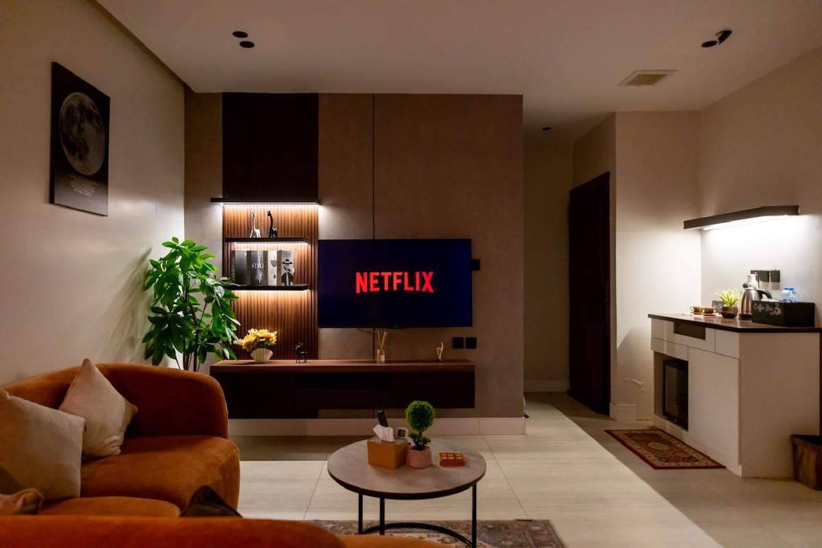 استوديو بتصميم دافئ ومريح، مثالي للراحة أو العمل. يضم سرير ماستر، شاشة 65 بوصة مع Netflix، ركن كوفي مجهز، ومنطقة جلوس. خدمة فندقية، واي فاي، طاقم نظافة ومشرف متواجد دائمًا لخدمتكم.