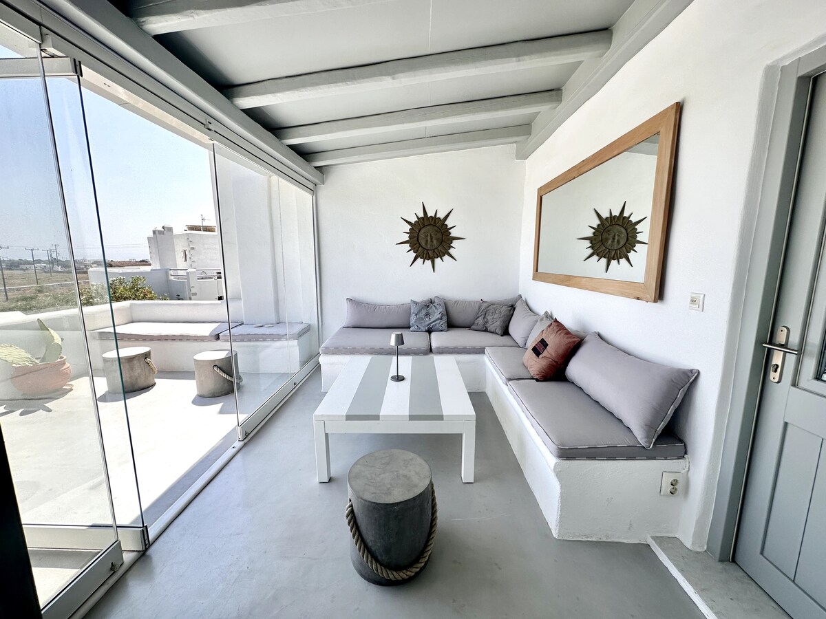 Open the sea-blue shutters and let in the cooling breeze, then whip up a snack at the urban concrete kitchen countertop at a breezy waterfront retreat. Step onto the spacious, leafy veranda for leisurely sunset drinks with unobstructed ocean views! The apartment is situated next to a sandy beach for a morning swim and a 2-minute walk from the center of Naousa and its main square. Shops, restaurants, bars, and clubs are within walking distance, yet the area is very quiet and calm!