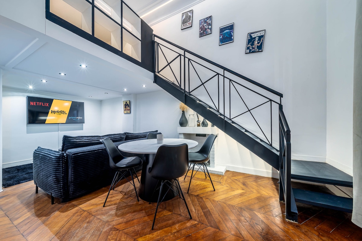 Duplex moderne situé à Passy, à deux pas du Trocadéro. Canapé XXL, TV 4K avec Netflix, cuisine toute équipée, chambre cosy en mezzanine équipée d’un rétroprojecteur avec écran de 5 mètres pour des soirées Netflix inoubliables comme au cinéma, salle de bain en marbre. Parquet en point de Hongrie, décoration contemporaine, literie haut de gamme, wifi rapide. Quartier résidentiel chic et calme, proche de la Tour Eiffel, des commerces, restaurants et musées.