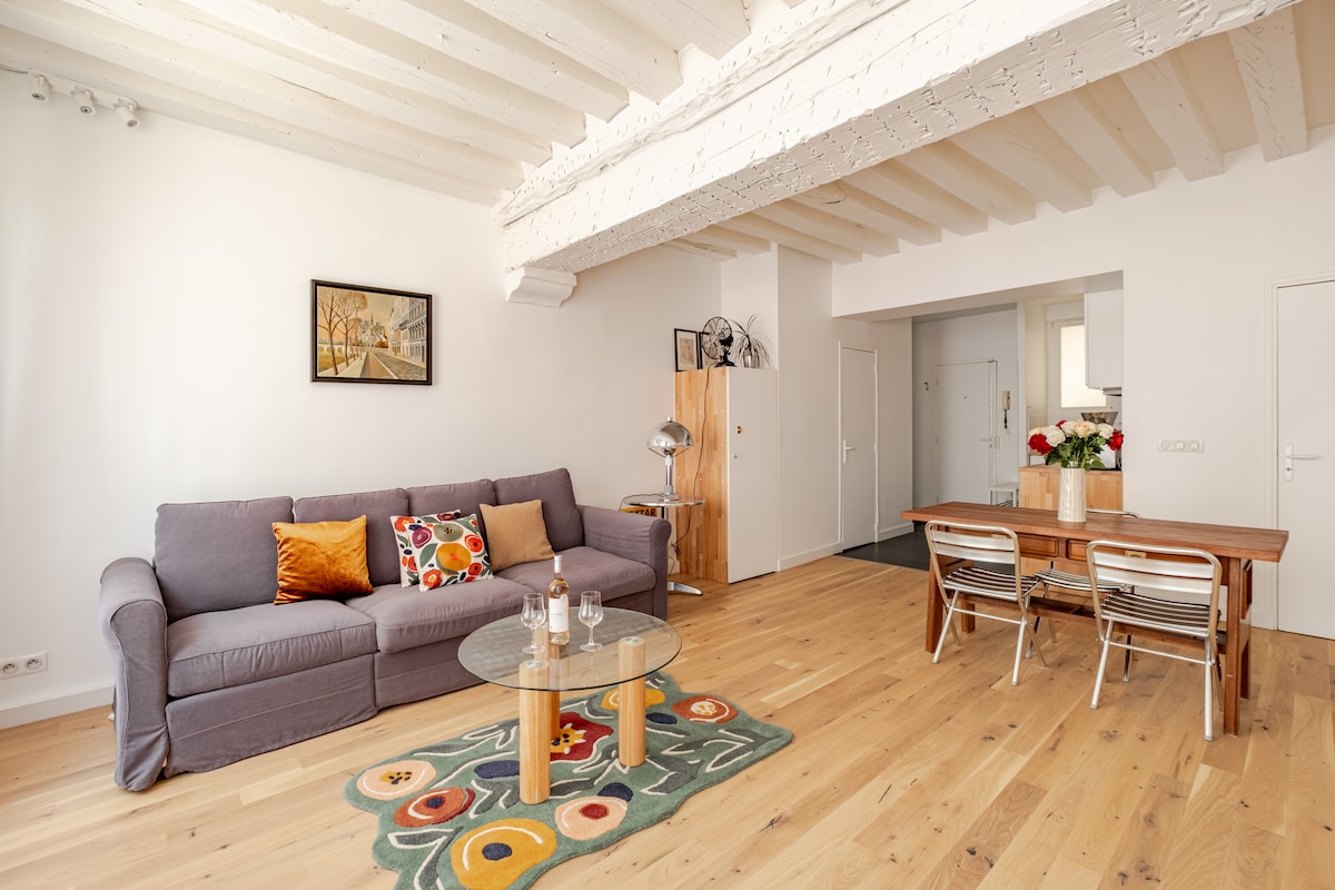 Welcome to our bright and charming 50m² one-bedroom apartment, on the 4th floor (stairs only) of a beautiful historic landmark monument building on île Saint-Louis, dating back to 1720. Step outside and immerse yourself in the timeless charm of old Paris, Notre-Dame, Le Marais, Latin Quarter, with many metro options nearby, you’ll be perfectly placed to explore Paris. Enjoy authentic Parisian life with bakeries, flower shops, cheese stores, cafés, and bookstores in our charming neighborhood.