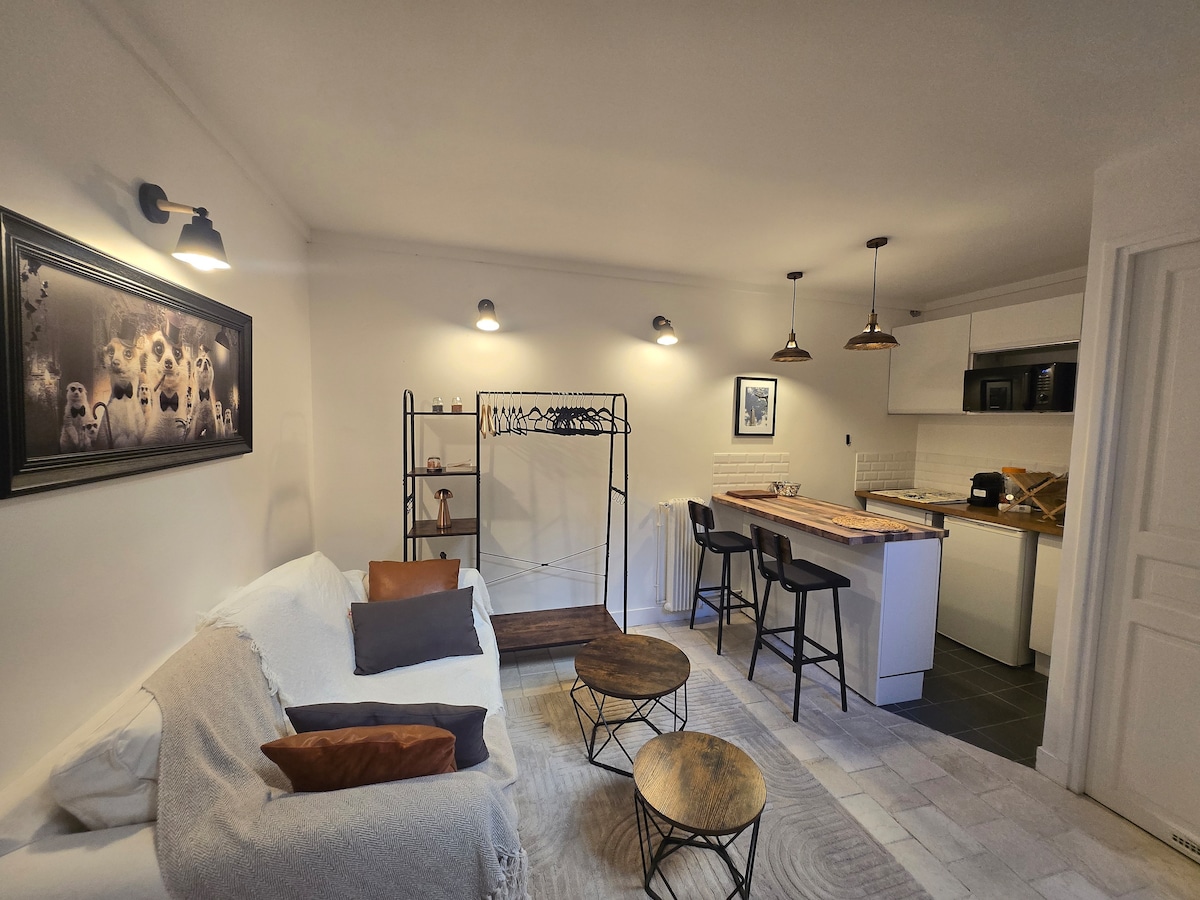 A pretty 40 sq./m flat renovated in 2023, for 4 people maximum, with superbe wounden exposed beams. The flat consists of a living room-kitchen and a bedroom overlooking a quiet courtyard/garden. In the bedroom, a double bed queen size 160. In the living room, a new pure leather sofa bed very comfortable and easily convertible. There is a few steps in the flat to access the shower-toilet wich is very small but pretty. The kitchen is well equipped. There is a washing machine.