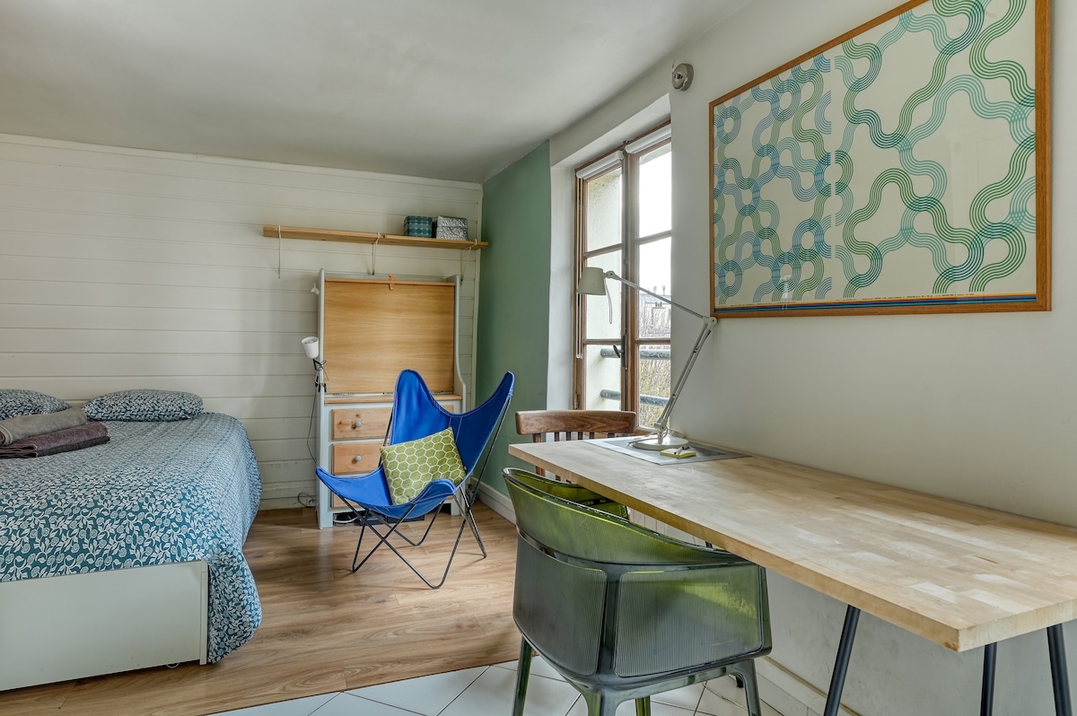 54 m² duplex apartment in the heart of Abbesses, Montmartre. Perfect for couples, friends or business travelers. On the 1st floor, day area with entrance, separate toilet, large living room with sofa bed, dining area and equipped kitchen. On the second floor, a double bedroom, bathroom with Italian shower, balneotherapy, double washbasin and toilet. The apartment is equipped with a washing machine, Nespresso machine, high-speed Wi-Fi connection and many other amenities for your comfort.