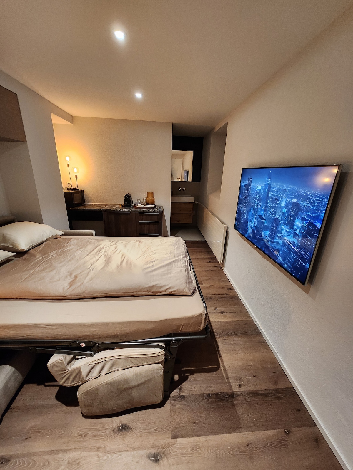 In unserem Einfamilienhaus vermieten wir unser modernes Studio. Das Studio befindet sich im 1. Sock, hat einen eigenen Eingang und ist komplett von unserem Wohnbereich getrennt, ausser dem gemeinsamen Treppenhaus. Wir legen viel Wert in Nachhaltigkeit und heizen unser Eigenheim mit Erdwärme und den Strom erzeugen wir mit unserer PV-Anlage. Erleben Sie das besondere Gefühl, mit einem guten Gewissen in den Tag zu starten. Direkt neben dem Hauseingang befindet sich eine gratis Parkmöglichkeit.