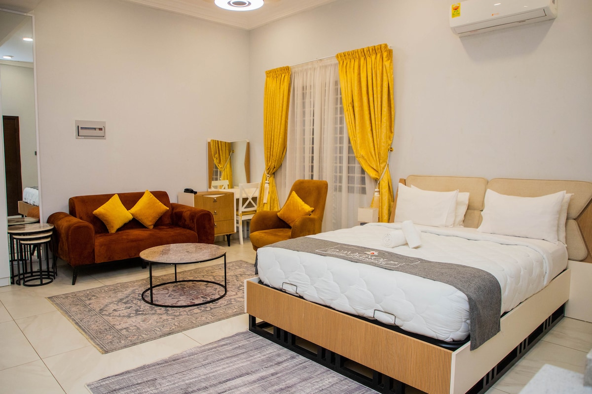 Feel at home in this peaceful one-bedroom retreat at Embassy Gardens, Cantonments. Guests love the spotless space, reliable high-speed Wi-Fi plus portable MiFi, and stress-free keyless entry. Enjoy quiet mornings on the balcony overlooking the pool, a fully equipped kitchen, a comfortable king-size bed, and strong AC. Safe, serene, and centrally located — many guests say they didn’t want to leave and always book again. Book now or add to your wishlist.