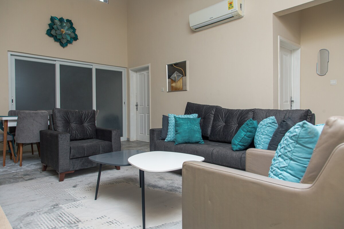 Newly built 2 bedroom at an excellent location. Welcome to our beautiful 2 bedroom apartment in the vibrant East Legon neighbourhood of Accra. This modern and spacious apartment is perfect for either business or leisure travel. The apartment features a stylish and comfortable living room, a fully equipped kitchen and 2 cozy bedrooms and private bathrooms. Step outside and explore the lively neighbourhood with it's trendy cafes and bustling markets. The airport is just 20 minutes away!