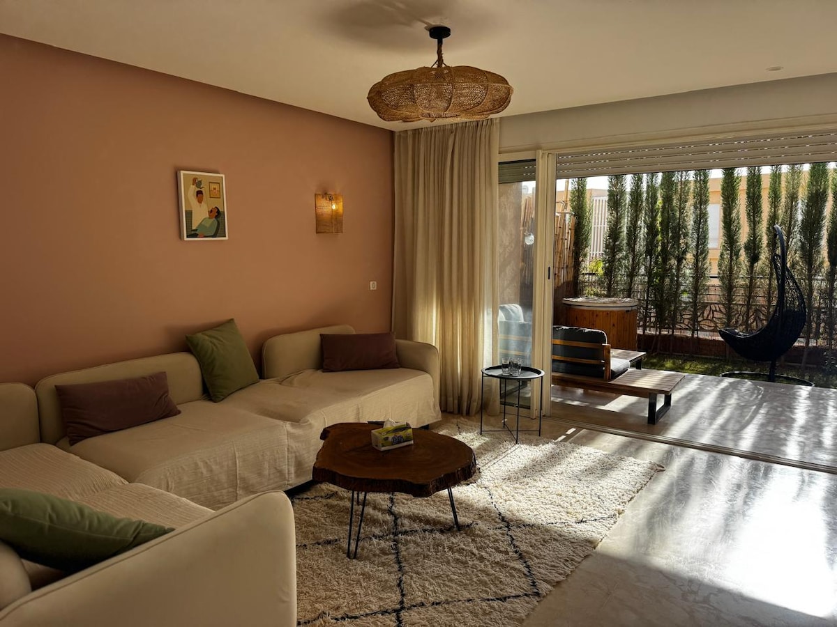 Appartement neuf, à la limite du haut de gamme, tout confort particulièrement bien agencé et adapté au travail à distance. 2 adultes maximum avec 2 enfants ou adolescents et 1 bébé. Wifi 100Mbps . Fibre optique. Climatisation (Marque Carrier) reversible Chauffage Vous serez à 8 minutes du Grand Stade, 10 du Souk, 14 de la plage, 25 de l aéroport. L'appartement a été conçue pour et par Hanane qui partage sa vie entre l'Europe et le Maroc. Tout a été pensé pour le confort des occupants.