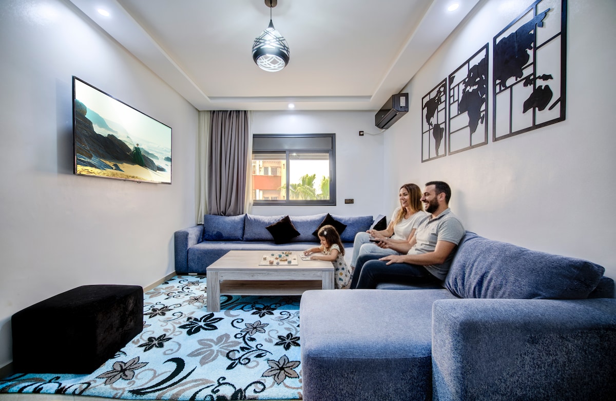 Appartement standing à Marina Agadir meublé avec goût, entièrement équipé. -1 CHAMBRE PARENTS+ DRESSING + SALLE de BAIN (baignoire) +loggia. - 1 CHAMBRE d’AMIS +Salle de Bain (douche) - 1 SALON 2 CANAPÉS + TV +wifi gratuit+ balcon - 1 SALLE à MANGER, 6 chaises (idéale pour télétravail) - 1 CUISINE ÉQUIPÉE La Résidence est située en front de mer, entourée de jardins luxuriants; de magnifiques piscines; à proximité de la plage; corniche; port de loisirs; boutiques...etc