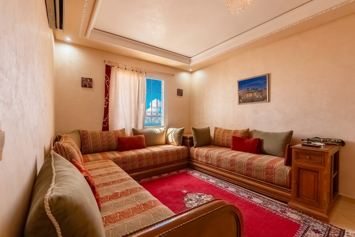 Agadir Talborjt Ce superbe Riad, en centre ville,à 15mn de marche de la plage,vous accueille dans un style marocain épuré et moderne Cette propriété,entièrement rénovée,offre une conception haut de gamme, unique sur Agadir! Vous entrez dans un jardin d’où monte un puit de lumière jusqu’aux 2 étages et la terrasse,dans la pure tradition des Riads Marocains Le jardin intérieur est un salon de repos avec télévision câblée et Netflix avec sofas,fauteuils et poufs marocain.Un vrai salon détente.