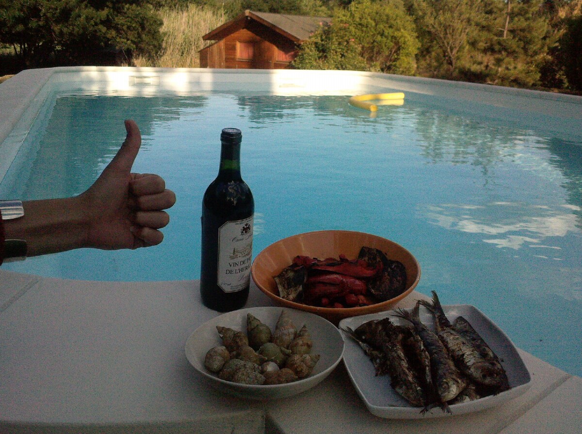 ECRIN DE VERDURE Logt de 60 M2 ( salon , cuisine , 2 ch, 1 SDB + 1 WC ind.)situé au Rez de chaussée d'une maison avec terrasse privative. le terrain de 28OO M2 et la piscine sont en commun avec les propriétaires. Situé à 2 pas de Montpellier ( 15 minutes) et de la Mer dans un village médiéval. Toutes commodités pour commerces et transport en commun. Prêt de vélo gratuit. Randonnées sur place. Accés aux équipements fitness + trampoline + table sous les pins......Log idéal pour famille.