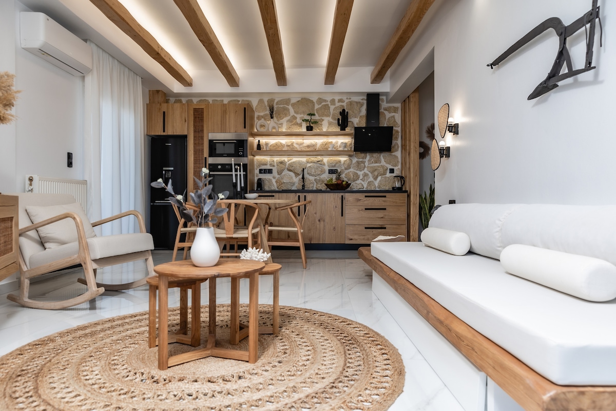 Our junior suite is close to Saint George beach (5min walking), Naxos' town centre, night life, public transport and facilities for all ages. It provides air-conditioning, fully equipped kitchenette, a smart TV, Netflix and wifi internet. The view of the terrace and the Cycladic design of the suite will make your stay unforgettable! The barbeque and the comfortable handmade mattress by Candia Strom will offer you relaxing moments in style.