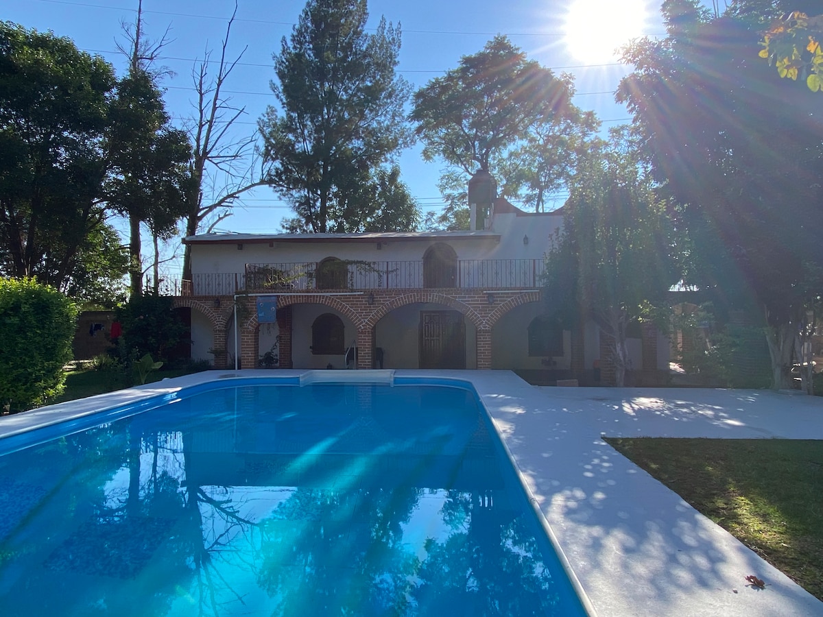 Este alojamiento es único en Aguascalientes, 4 habitaciones cada una con baño, Aire Acondicionado en 2 recamaras, alberca privada, gran jardín con palapa, asador y mesa para 10 personas. Una casa de campo construida en 1995 y recientemente remodelada ofrece espacios amplios, cómodos y con el toque mexicano de una cabaña. Ubicada en una colonia con vigilancia 24/7 y control de acceso, de las zonas más seguras de la ciudad. A 10 min en auto del centro histórico, restaurantes, supermercados.
