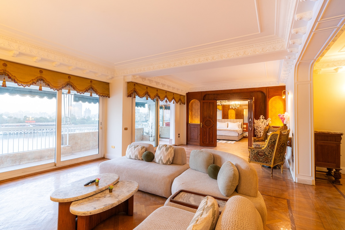 Located in Al Manyal, an island in the center of Cairo, this exquisite one bedroom serviced apartment is situated on the sixth floor of a vintage hotel that has exceptional water views with direct frontage on the Nile River. Whether you gaze at the serene Nile or the adjacent skyline from the Master Bedroom or the Living Area, this apartment will make you forget you're in the heart of the city.