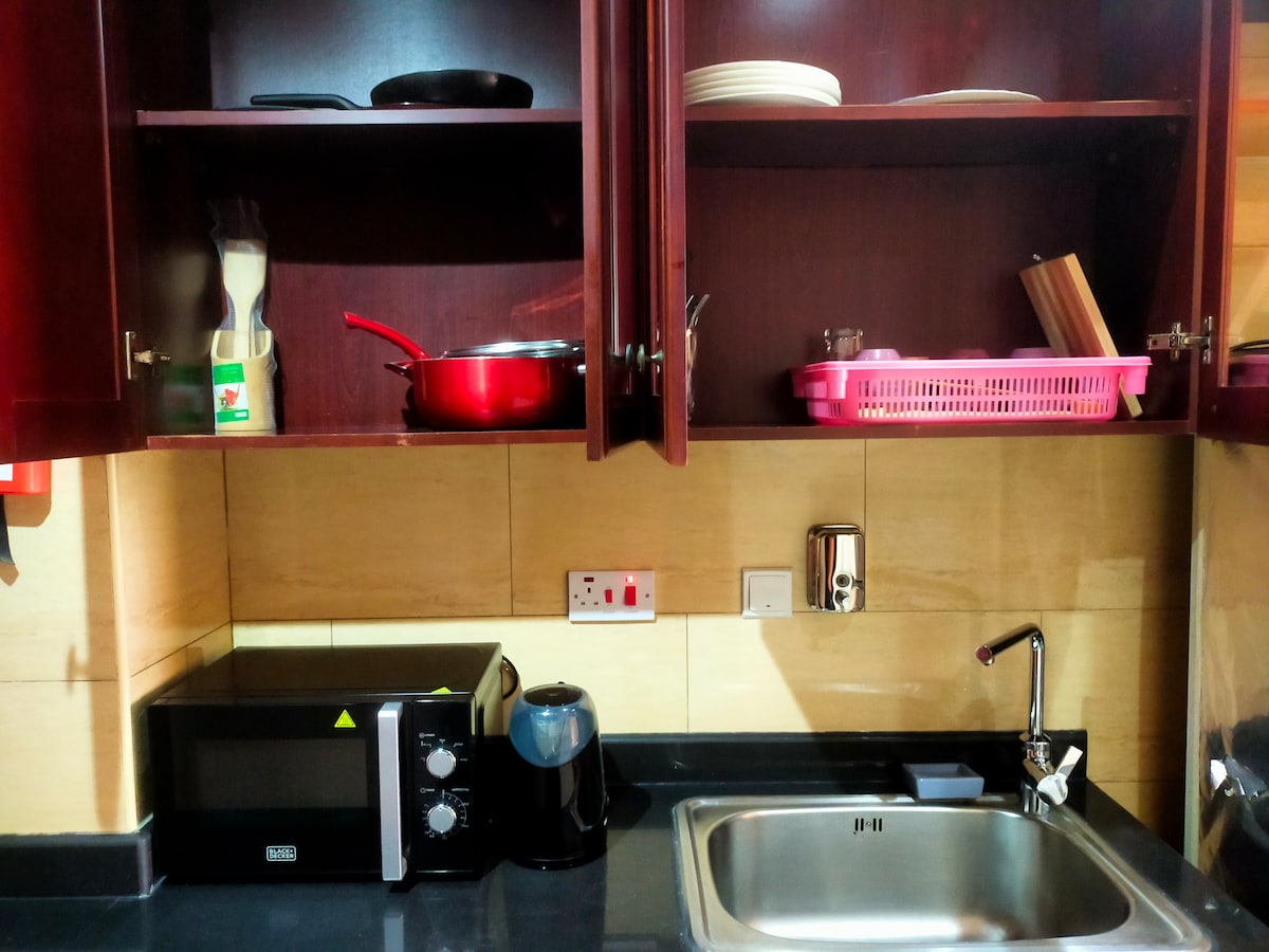 Take a break and unwind at this peaceful space while taking in the beautiful waters from the balcony. Studio close to free Beach, Golf course, Marina and luxury hotels: Ritz Carlton, Waldorf. 20min drive to the Hajar Mountains, 5min to Alhamra. Lockbox access. Parking, Pool, play area. Full sea view from balcony. Sleep: King size bed+Kitchen: cooker, w/machine, Fridge, Dolce Gusto, toaster. Other: Wifi, Smart TV, 24/7 market/cafe. Walking distance to restaurants, Sailing and Yacht Club.
