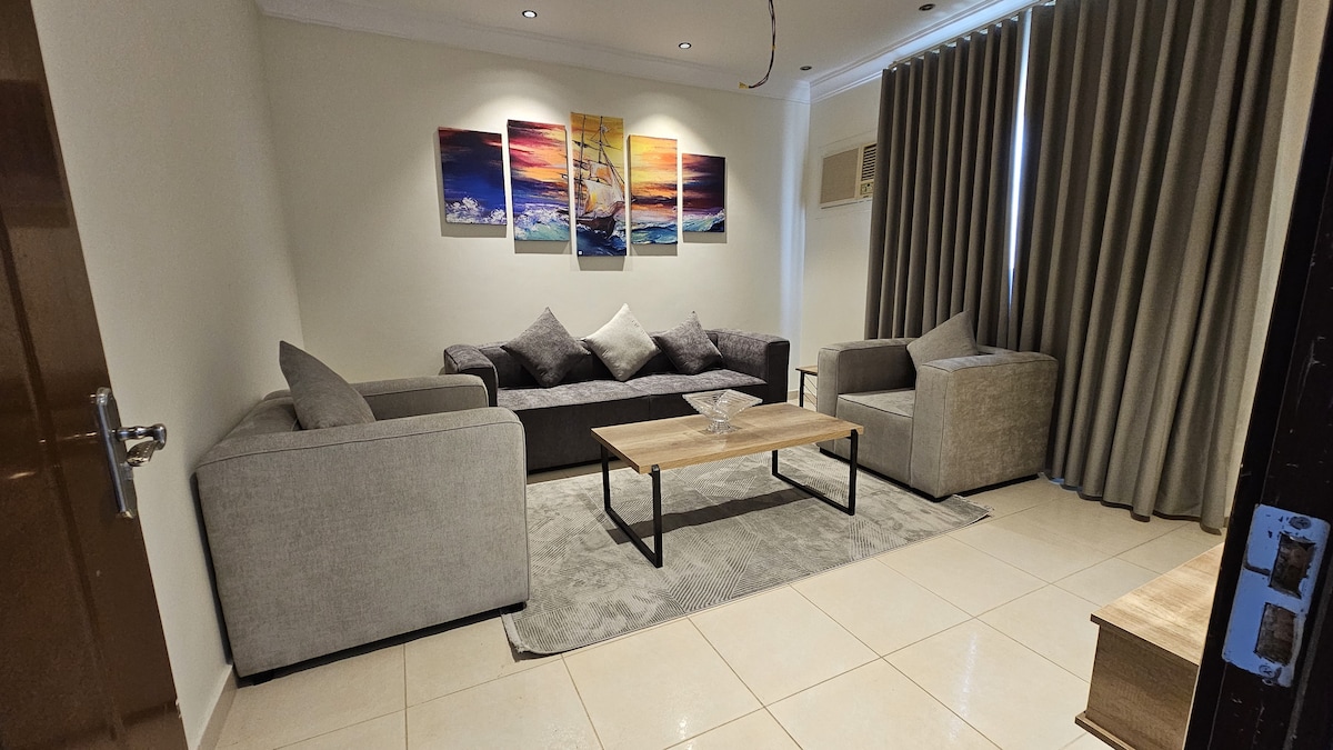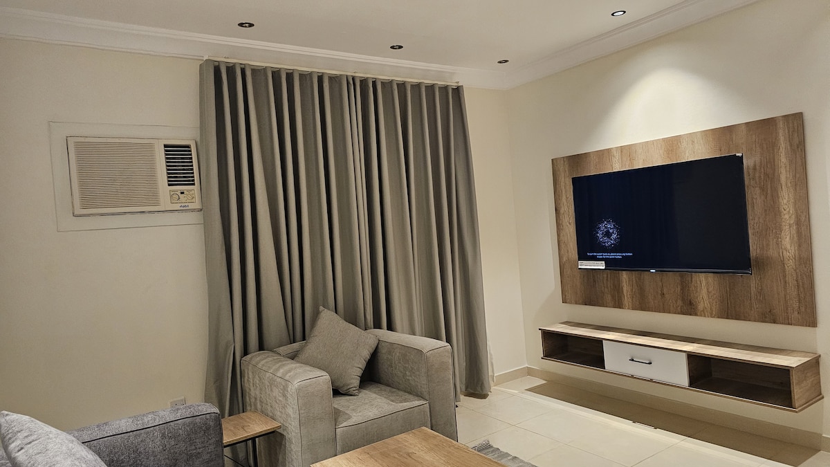 A quiet residence with a modern design that combines elegance and comfort, ideal for guests seeking tranquility and privacy. It includes a stylish seating area, a comfortable bedroom with a luxury bed, and a coffee corner. Clean, with calm lighting and a modern touch, suitable for relaxation, work, or a short stay. - Close to services. - Self check-in. - High-speed internet. -Parking available. -65-inch TV with Netflix. -Blackout curtains for light blocking.