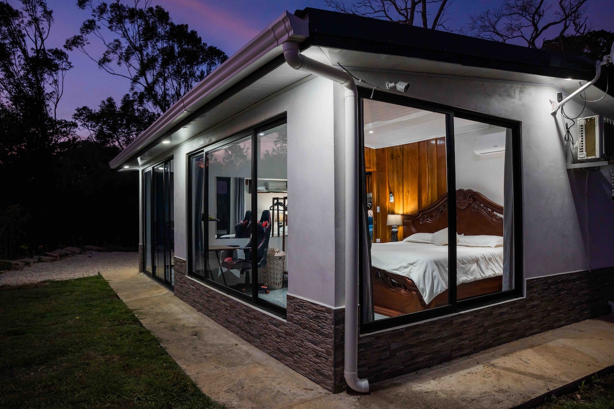 Private house. 1 queen bedroom, 1 single bedroom, 1 sofa bed, 1 full bathroom, hot water, kitchen. Very large windows. Private entrance and parking. Air conditioning. Powerful Wi-Fi. Stay in a private nature sanctuary. A variety of frogs! And wildlife, including toucans. Sit on the lagoon dock, take a peaceful stroll along the numerous creek trails, or enjoy an exciting night hike. Perfect stopover from San José to La Fortuna 702.