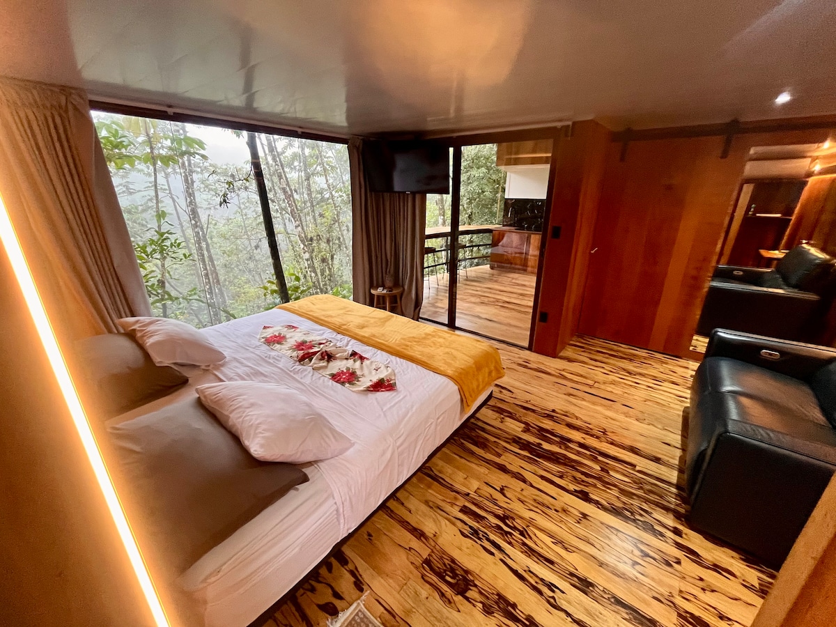 Esta habitación está fabricada con amor , baño cocina y cuarto principal con vista a la naturaleza, los acabados son de madera de teca exclusiva y los muebles de la cocina con madera de cedro , amplios armarios / escuchas el río que pasa al lado , te conectas con el entorno / luces cálidas / tv retráctil/ cocina de gas / refrigerado grande / cama king / tenemos un sendero privado para caminar y un puente de hamaca para ustedes disfruten , 5 minutos del centro de la ciudad ….