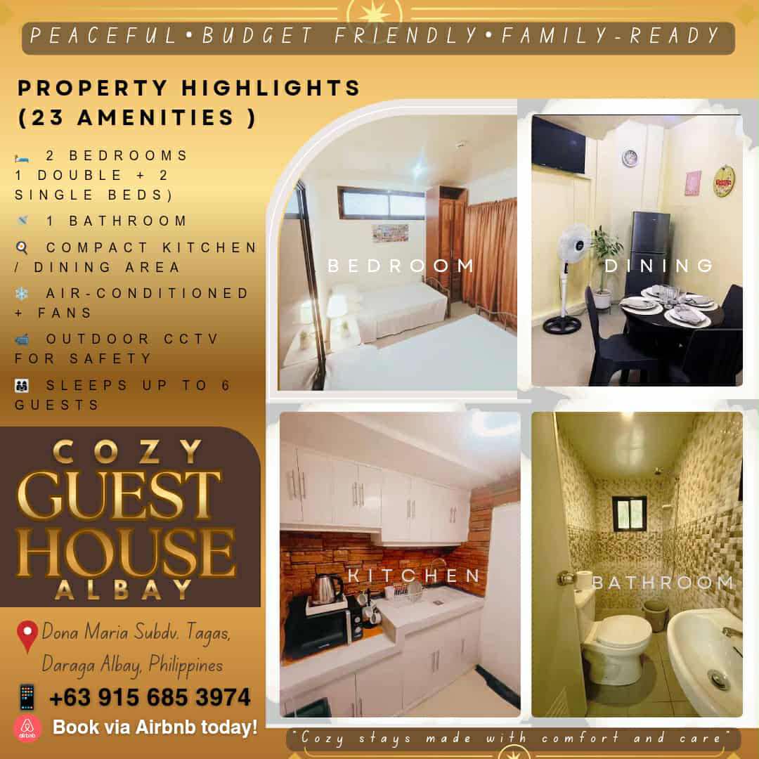 Welcome to our cozy guest house in Daraga, Albay! Peaceful and budget-friendly, it accommodates 4 people (extra guests allowed with an additional charge). A bakery is right next door, while cafés, grocery stores, and laundry services are all nearby. With easy GrabCar access, you're just minutes away from Mayon Volcano, Cagsawa Ruins, and the best of Albay. Perfect for families, groups, students, and backpackers alike! We also offer breakfast options for an added cost — simply order in advance