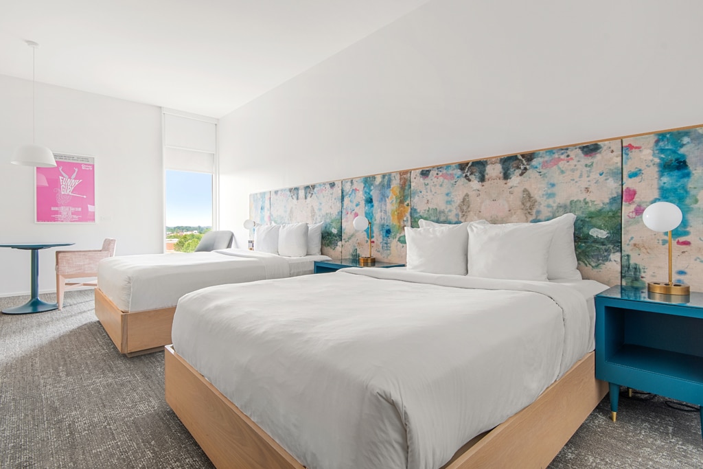 Jeff Suite 201: Mall-facing! Each room is individually furnished with a distinct personality. Think effortless cool, creamy suede, and desert colors with pops of quirky humor. To ensure privacy and true getaway vibes, The Jeff was designed to be entirely self-service (no front desk or need for check-in). Upon booking, you will receive a unique code that gives you access to your room.