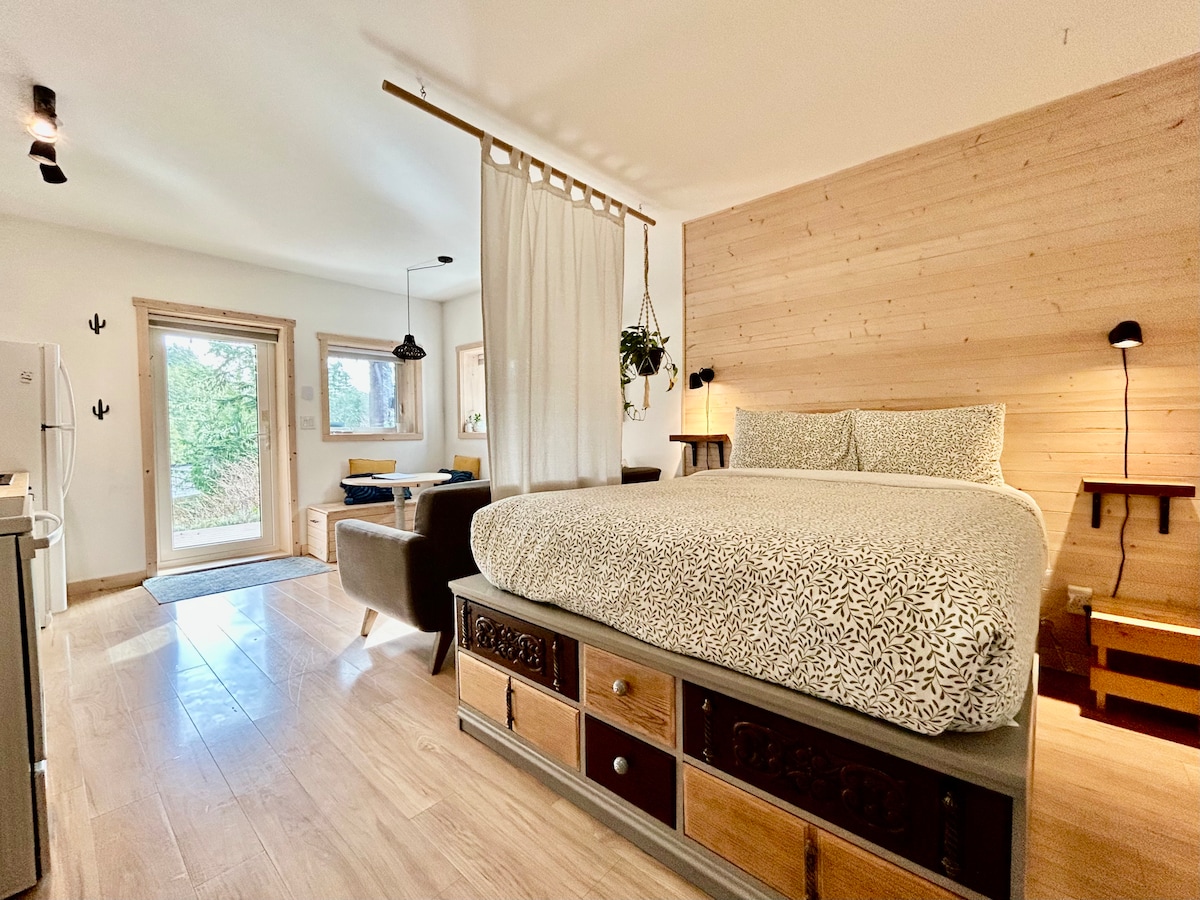 Sawing Logs Suite is a brand new (2023) hotel room style suite + kitchenette, BBQ and outdoor space -- ideally located in a rural setting on Sterling Arm of Sproat Lake and only 10 minutes from town. Suitable for individuals, couples or small families, for short or medium stays. Sawing Logs Suite is the perfect jumping off point for your Port Alberni and West Coast adventures. Pack N Play available for families traveling with infants.