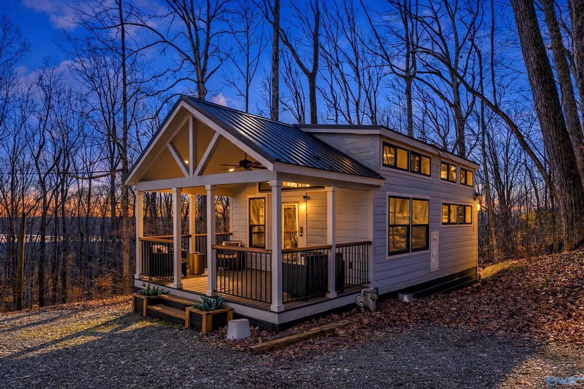 Host owned, clean and stylish getaway with all the necessary amenities. This tiny house has a fully equipped kitchen, washer/dryer, bathroom, bedroom with queen sized bed, and loft with another queen sized bed. Spend your time in the cozy living room with the light of the electric fireplace or on the great covered porch. You can see the water from the porch and are only a minute's drive to put in your boat at Waterfront. The City Harbor and Cathedral Caverns are nearby and Parking is on site.