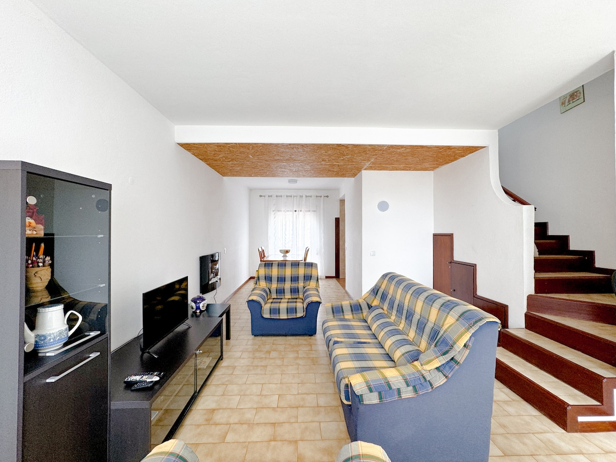A sua família ficará perto de tudo! 5 minutos das praias a 10 passos das lojas,... Todas as comodidades, Internet, WiFi, Churrasqueira, Cozinha Completa(Totalmente Equipada), Maquina Lavar Roupa e Loiça, Quartos com boas áreas e Sala ampla, WC de serviço na Sala e Casa de banho completa no piso dos quartos. Excelente local para Surf! Pranchas Softboard 6.0 37L Ocean&Earth e TORQ Epoxy 7.4 56L e fatos surf XL;L;S incluídos e 3 bicicletas... Fique neste paraíso na vila entre o campo e o mar!