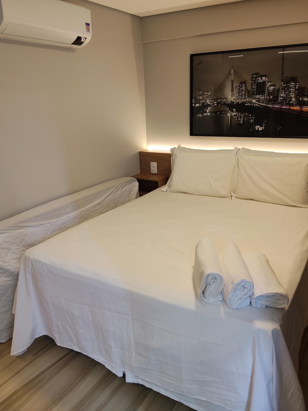 Brand new apartment, with a contemporary style, of a high standard and very well located, with a privileged view of Allianz Parque. Next to shopping malls, various businesses, means of transport, parks, tourist attractions and business buildings. The studio is complete, with a comfortable queen bed, Smart TV and Internet. Kitchen with all utensils, cooktop, refrigerator and microwave. With parking (rotary). Close to everything, cozy, perfect for experiencing fantastic moments.