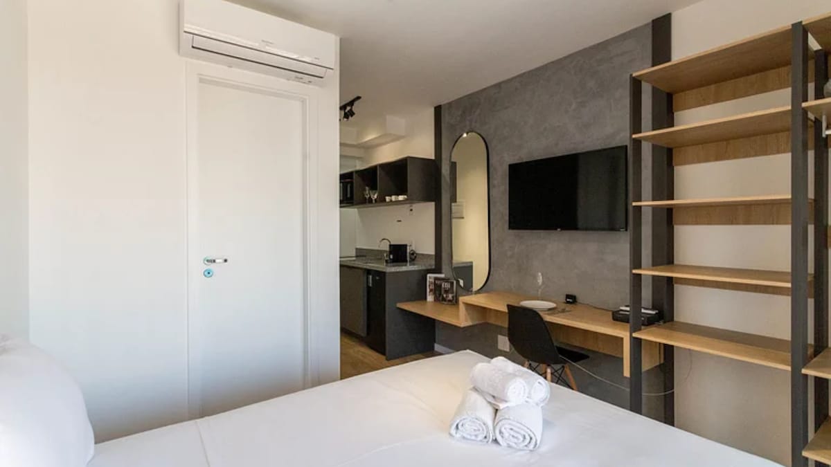 Brand new apartment, with a contemporary style, of a high standard and very well located, with a privileged view of Allianz Parque. Next to shopping malls, various businesses, means of transport, parks, tourist attractions and business buildings. The studio is complete, with a comfortable queen bed, Smart TV and Internet. Kitchen with all utensils, cooktop, refrigerator and microwave. With parking (rotary). Close to everything, cozy, perfect for experiencing fantastic moments.