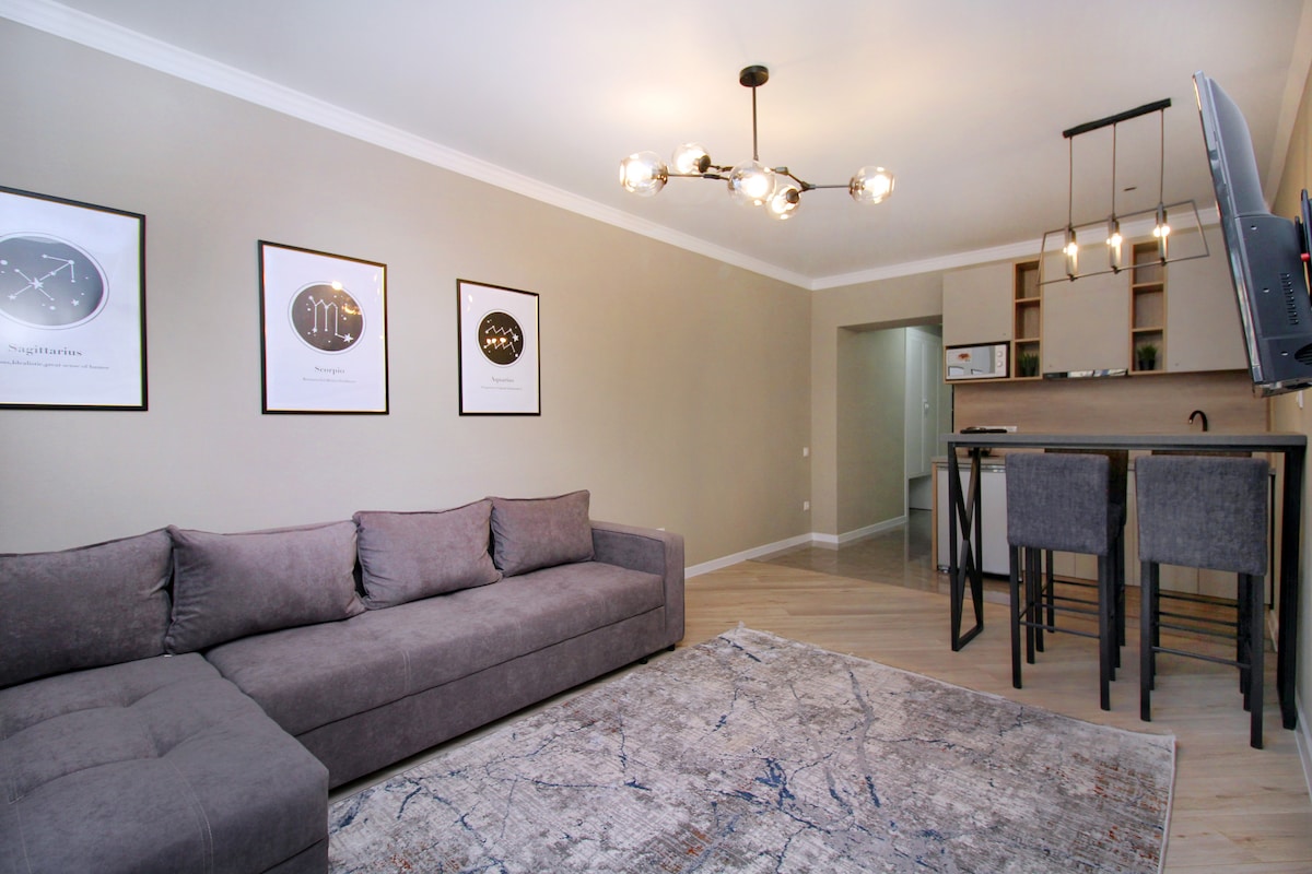A very warm, cozy, recently refurbished and featuring modern design apartment. It is situated in a quiet area with walking distance to Atakent Expo center, botanical garden, grocery shops and bus stations. It's very comfy to stay in!