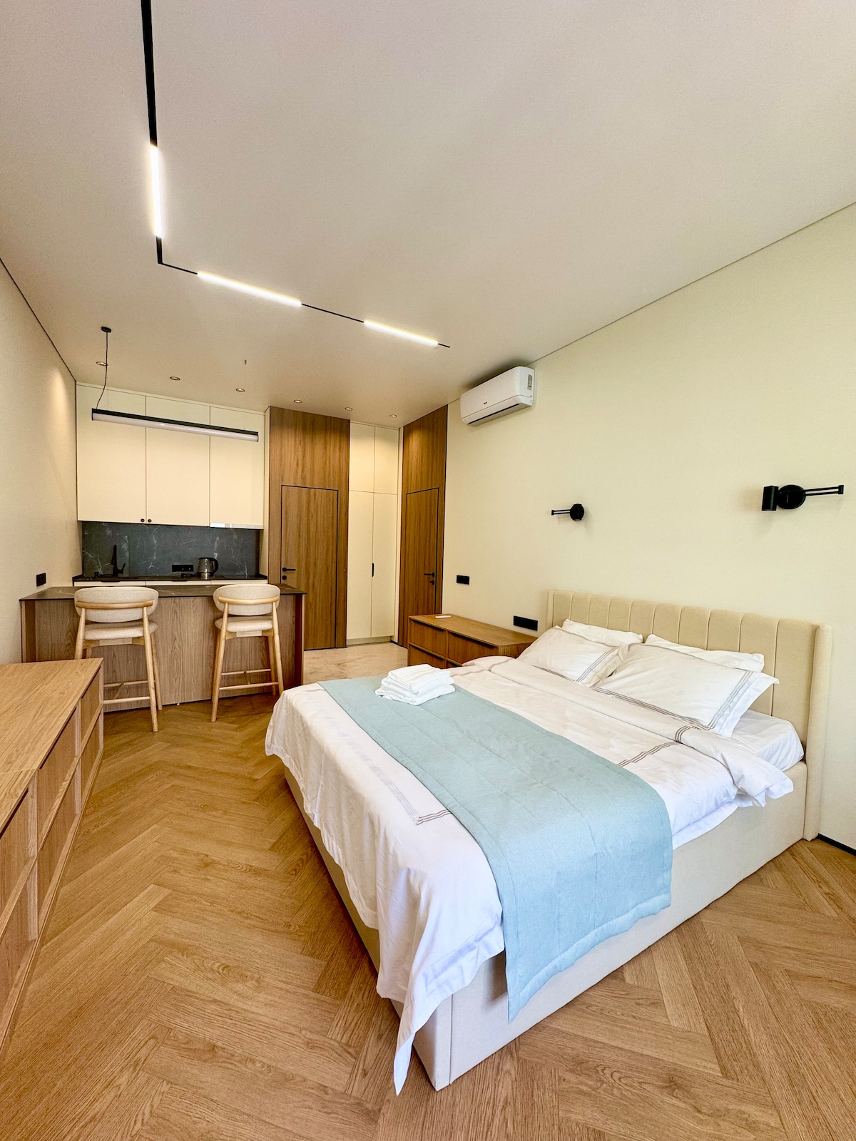 Один из лучших вариантов проживания в этом комплексе! Идеальная чистота и комфорт! Квартира оснащена шкафом для одежды, стиральной машиной, сушилкой для одежды, собственной ванной комнатой с душем в квартире также высокоскоростной, телевизор-смарт с диагональю 49 дюйма, удобные ортопедические матрацы, шторы black-out. Вы можете готовить как дома, кухня оснащена приборами первой необходимости. Квартира расположена на 9 этаже нового жилого комплекса