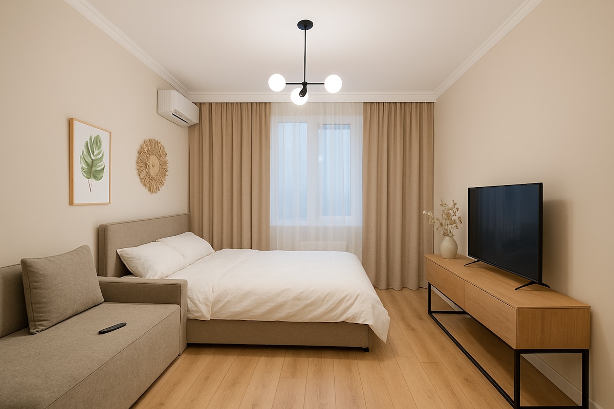 Cozy apartment in the city center with mountain view. Чистая и уютная квартира-студия на 12 этаже в тихом районе центра города. С балкона открывается шикарный вид на горы: утром можно встретить день с чашкой кофе, а вечером наслаждаться огнями оживлённого города. Интерьер в спокойных тонах создаёт атмосферу уюта и гармонии, а кухня-студия позволит приготовить любимые блюда. Квартира отличается идеальной чистотой, свежим постельным бельём и продуманным комфортом для вашего проживания.