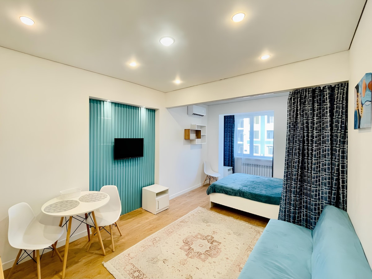Это стильное жилье идеально подходит для пары, друзей и подруг и индивидуальных путешественников. Шикарный вид на горы Заилийского Алатау. Вид на озеро Сайран. Прекрасное место для прогулок и пробежки. В апартаментах все необходимое для хорошего отдыха! Ортопедический матрас, смарт ТВ, новая мебель и техника. Мы рады видеть Вас у нас в гостях!