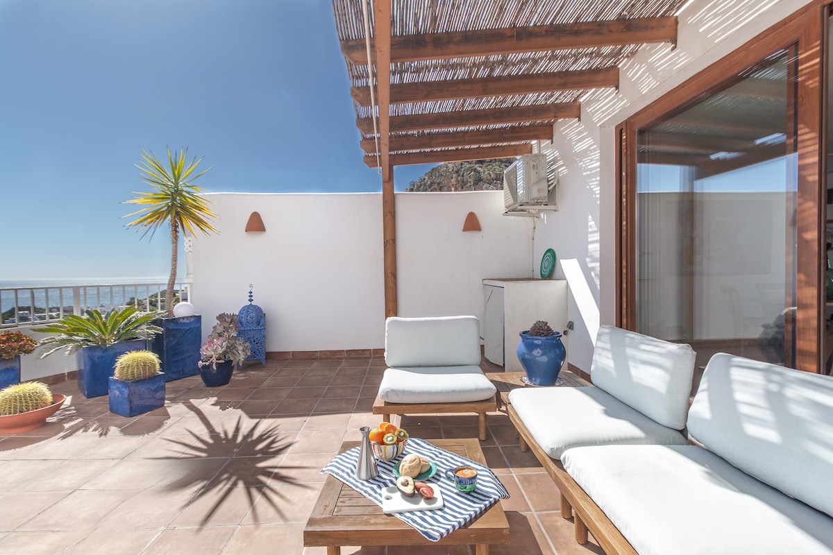 Large sunny terrace with sea views just 50 m from the beach in Mojácar. Enjoy breakfast while the sun rises over the Mediterranean, and relax in a bright, spacious home with carefully designed Mediterranean décor. Comfortable single-level home, perfect for unwinding, remote working, and enjoying the sea breeze just steps from the beach, restaurants and cafés.