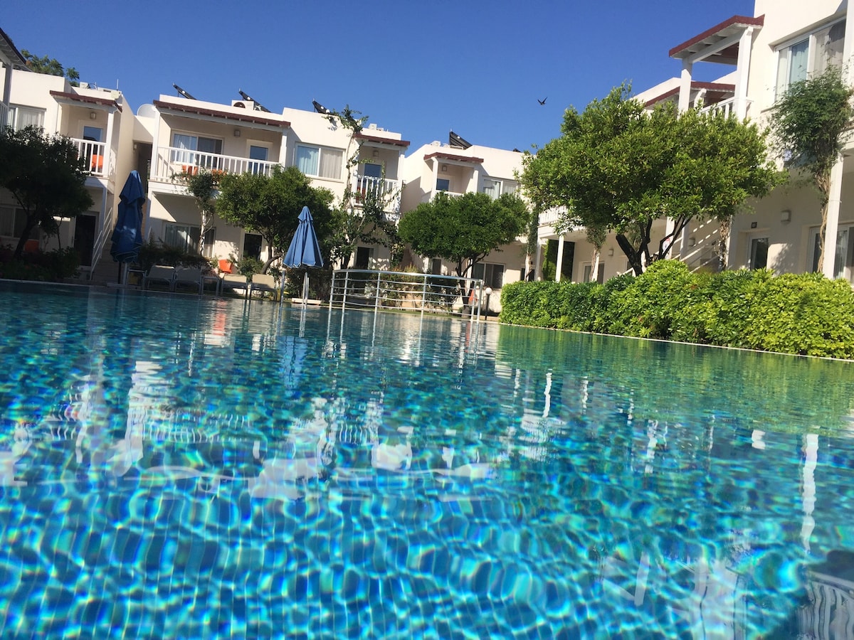 2024 yılında her şeyimzle tamamen yenilendik ve Haziran ayında tekrar açıldık.Klima,no frost buzdolabı,tv, bulaşık ve çamaşır makinesi standarttır.Gunluk temizlik,hijyenik havuz ,bar ve restoranımiz ile ev konforunda butik otel hizmeti veriyoruz.Oldukca merkezi konumdayiz, her yer 5 10 dakikalık yürüme mesafesinde, Bodrum marinaya bileyürüyerek 20-25 dakikada gidebilirsiniz.Yakin olmamiza rağmen Gümbet barlarinin gürültü ve karmaşasından uzakta sakın ve nezih bir konumdayiz..Beklerim.