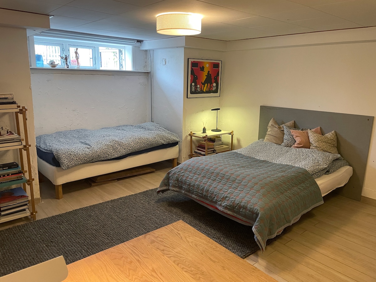Let this be your wellness hub near Copenhagen. The outdoor electric sauna and cold-plunge are accessed via the master bedroom (double bed) + own bathroom. There's a bunk-bed (70x160cm) and a creative space in the kids-room. The second bathroom has a bathtub, and is accessed from the spacious dining + lounge area. The cozy open kitchen completes the social space. The private garden equally invites for relaxation. The cat is friendly (own door, automatic food and water). 10 min walk from train.