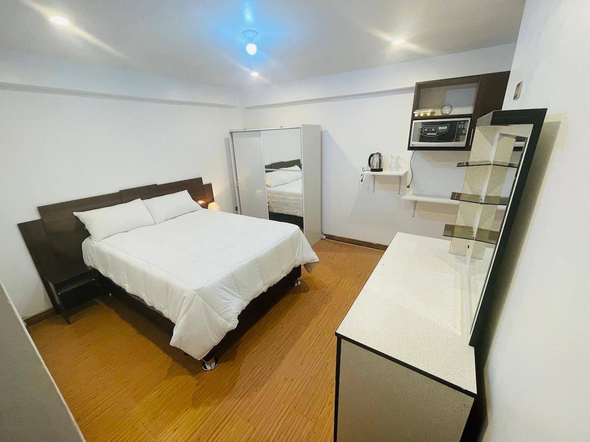 Disfruta de una experiencia con estilo en este alojamiento céntrico. Es una habitación muy cómoda. Situado en un barrio turístico de Huaraz (La Soledad), a poca distancia de la plaza de armas (5 min a pie). este lugar esta cerca a muchos restaurantes y tiendas de conveniencia. En su interior puedes encontrar todo lo necesario para pasar unas vacaciones increíbles. La habitación es con baño privado y tiene una cama matrimonial, microondas, hervidora y menajería esencial.
