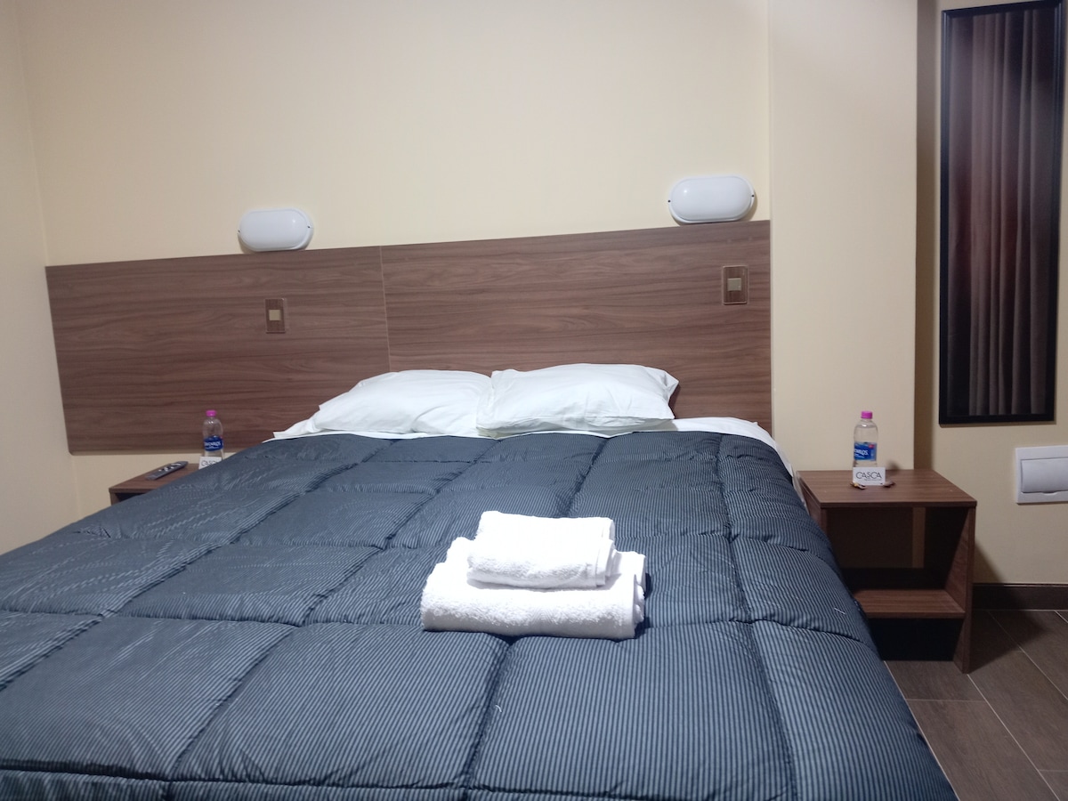 Disfruta de la sencillez y la tranquilidad en un lugar céntrico, llega a la plaza de HUARAZ en 1 minuto caminando, cerca a bancos, markets, farmacias, restaurantes, diversión en inmediaciones. Las habitaciones cuentan con: - Baño privado, ducha caliente 24 horas sistema a gas y solar - Smart TV, para tu diversión. - Wifi de alta velocidad - A tu llegada encontraras: toallas, papel y jaboncillos. - Agua caliente en Termos para mates de coca y otros.
