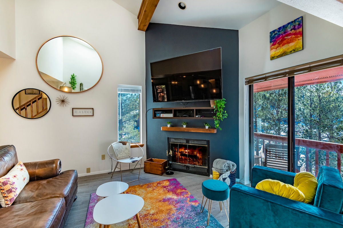 Remodeled just last year! Sure to be the coolest condo in Angel Fire! 😎 This fun rendezvous is nestled in the woods of the Pinetree Commons complex. It's only 2 blocks from the AF Resort. Close to skiing, biking, hiking, golf and more! Grab a drink and enjoy one of the 2 outdoor balconies or cozy up by the fire. The interior is fun and inviting... with eclectic murals and decor offering a different experience than anything in the area! Perfect for families/friend groups! 😊