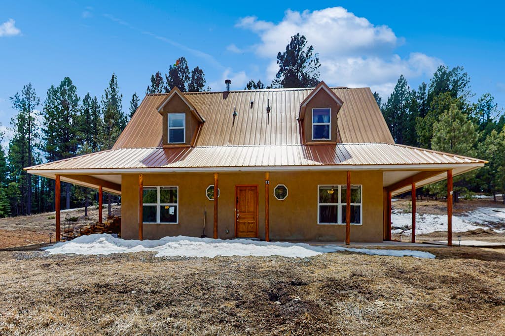 One of a kind contemporary custom mountain home. Enjoy nature from the living room with floor to ceiling picture windows. After a day of activity spoil yourself in the jacuzzi on the deck under the stars. Gather with family & friends in the great room and kitchen area. Total privacy. Built-in BBQ. Minutes from Angel Fire Ski Resort for winter sports or mountain biking in the summer, along with zip line course. Angel Fire Country Club and Golf course available. Close to town & grocery store.