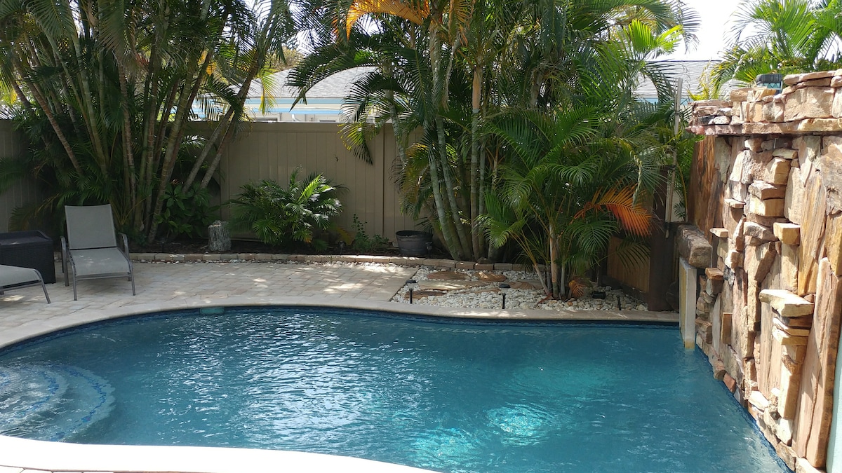 High end, luxury 3/2 pool home! 7 4k TVs w/ Netflix and cable (75" in living room), SONOS throughout house/pool, wifi, PS5, private heated salt water pool/Spa, putt putt, foosball, beach gear, Pack & Play, Game room (board games, billiards, shuffle board, arcade), massive kitchen/bar, washer & dryer, garage parking-- all in a quiet and safe neighborhood. Just 5 miles to the best beaches and restaurants. Entire home with no shared amenities!