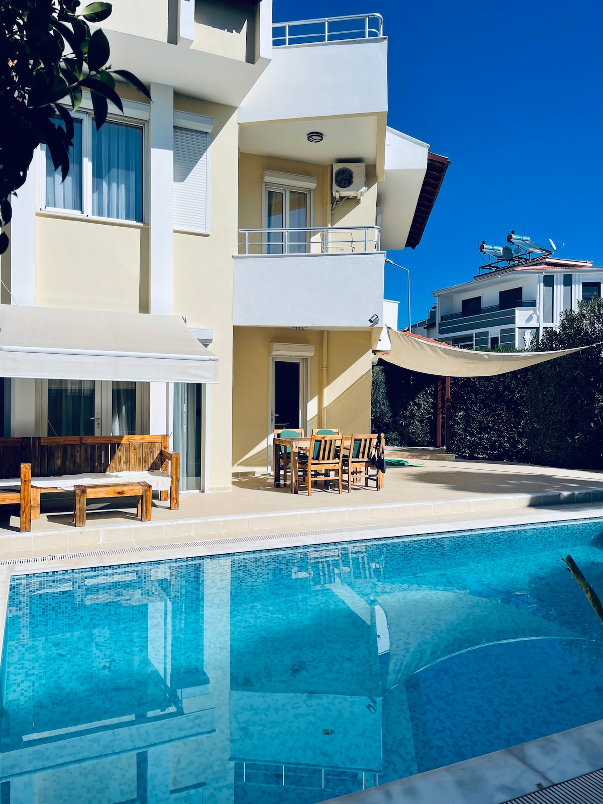 Kaliteli eşyalarla döşenmiş konaklama yerinde ailece dinlenebilirsiniz. 100 mbps sınırsız internet vardır .Havuzu müstakil olup üstünü tente ile kapatma imkanı vardır. Havuz bakımı sürekli yapılmaktadır. Havuz başında solar duş vardır.Terasta Weber marka mangal vardır . Havuz başındaki teras, batı cephe olup sabah kahvaltısı için güneşin etkisi olmadan harika bir ortam sağlar . Tüm odalarda klima mevcuttur. KIŞ KONAKLAMALARI İÇİN YERDEN ISITMA VARDIR.