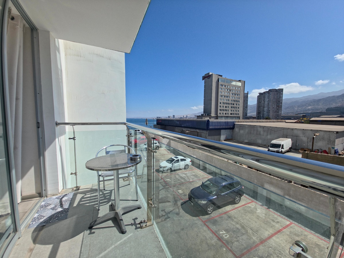 Apartamento de un ambiente ubicado en el mejor sector de Antofagasta, plena costanera centro, a un costado del Mall Antofagasta. Posee terraza panorámica con desayunos y carta de tragos. Decoración elegante y acogedora para disfrutar de unos atardeceres perfectos acostado y disfrutando para descansar como se merece. Conectividad con toda la ciudad. Este apartamento es usado por el dueño cuando esta de viaje en Antofagasta, entonces esta completamente equipado con todo lo que puedan necesitar.