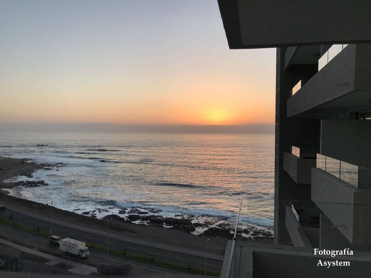 Departamento en primera linea piso N°18 Vista impagable al mar, Decoración con toques personales lo hacen sentir como un hogar, cerca de principales atractivos turisticos como balnearios, plaza,monumento natural la portada, entre otros. A metros de terminal de buses Hospital regional de antofagasta Supermercado Farmacias Clinica meds Pronto copec Pizzeria Restaurant superzoo Veterinaria Wendy's Subway Gasolinera Chilexpress Laboratorio clinico uc NIU Sushi Mall chino