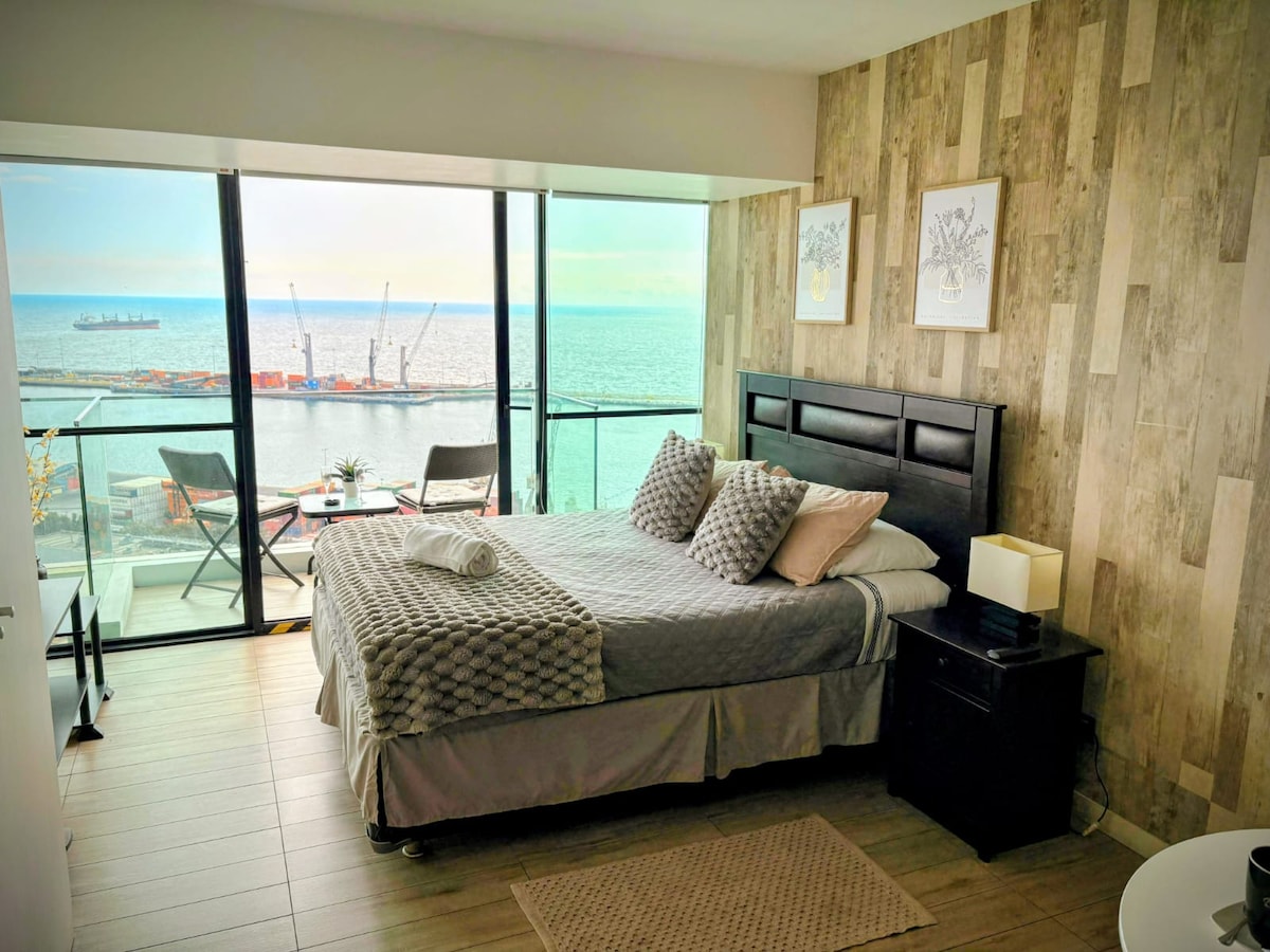 Exclusive Apartment se encuentra frente al mar con una vista privilegiada de la ciudad. Tiene una excelente ubicación a pasos de : Mall Plaza, centro de la ciudad, locomoción, supermercados, entre otros atractivos turísticos. El apartamento dispone de 1 dormitorio, 1 baño, ropa de cama, toallas, TV, cocina totalmente equipada, lugar de trabajo, vista panorámica de el borde costero de la ciudad, además dispone de áreas comunes como la utilización de piscina y/o otros servicios.