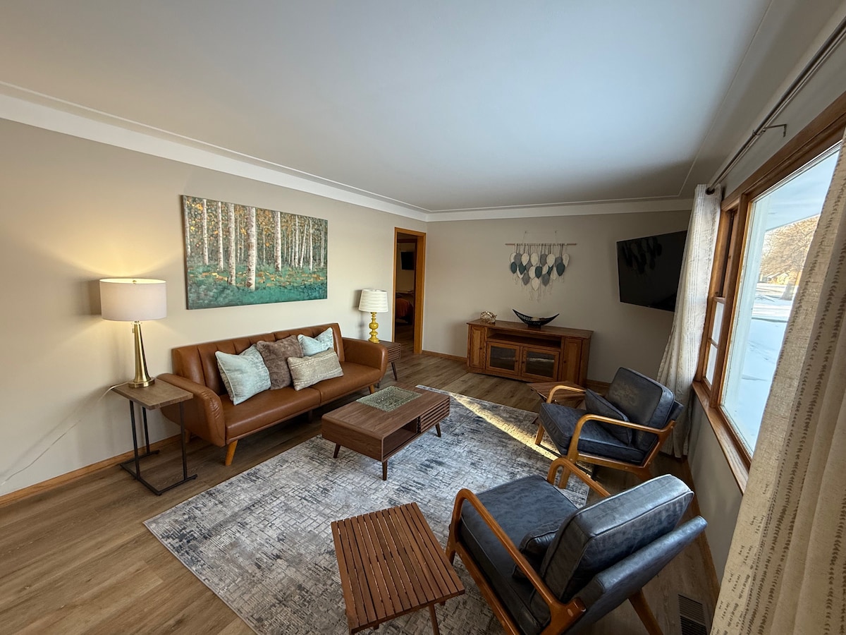 THIS IS NOT the whole home, but is the entire lower level, which feels like one of the units in a duplex. Cabinesque, roomy, close to almost anything you would need, cozy- these are a few words to describe it. You have your own private locked entrance from the garage, where you can park. The door between the levels is locked. This space boasts a gorgeous, new bathroom, new kitchen, huge flat screen tv, 2 large bedrooms, with the dining room and living room connected.