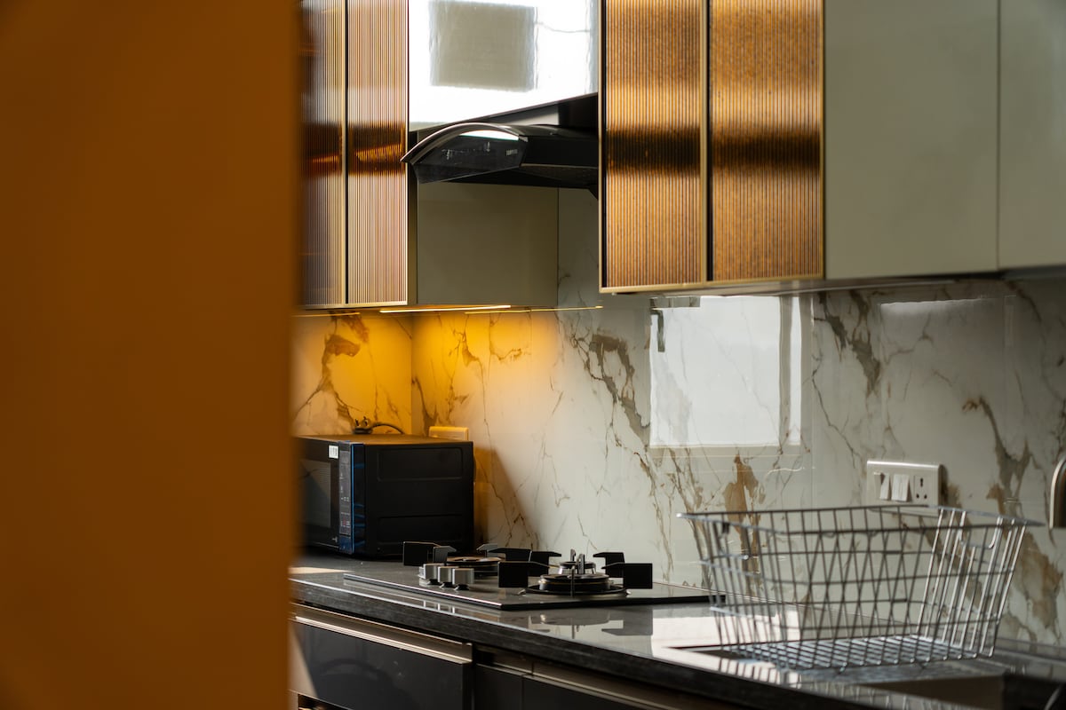 Experience comfort and style in a sanctuary designed for work and relaxation. Rest on a Wakefit orthopedic mattress and enjoy warm ambient lighting. Stay productive with an ergonomic workspace and unwind with two 42-inch TVs. The attached bathroom offers premium toiletries and a lit vanity mirror. Cook effortlessly in a fully equipped kitchen. Relax on the sofa in a space where peace, productivity, and lifestyle blend perfectly.