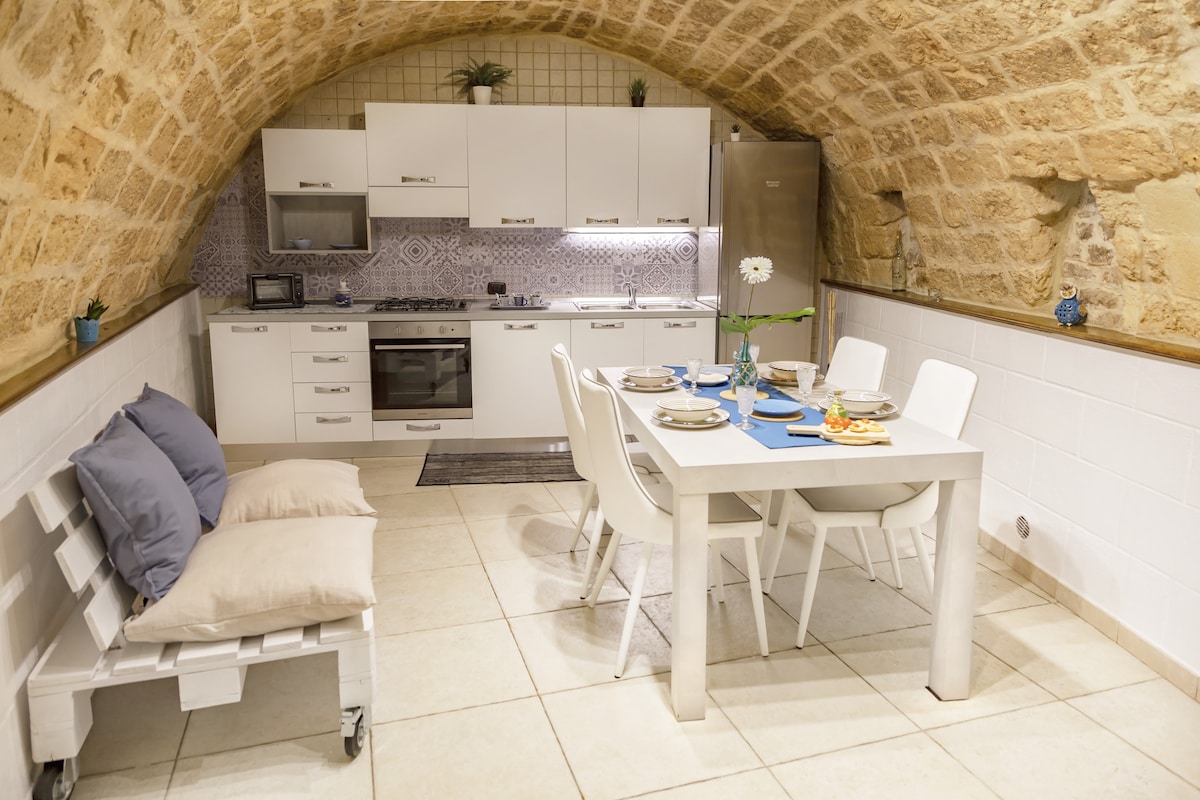 Accogliente dimora tipica pugliese, costruita in muratura con volte a botte, corredata di camino e atrio esterno. Intera Casa affittata per brevi periodi CIN IT072030C200071534 - CIS BA07203091000031246 Lavatrice e Asciugatrice ad uso gratuito. E’ in pieno centro cittadino dista 450mt da spiaggia Cala porta vecchia, 900mt da cala porto rosso; a 400mt da Piazza Vittorio Emanuele, 750mt dalla stazione ferroviaria, 400mt dall'ufficio poste, 800mt dal Castello Carlo V.